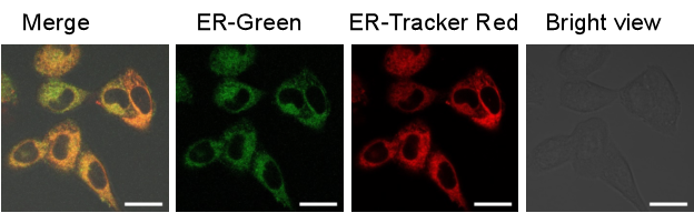 ER-Green是生光生物科技公司通過對對文獻(xiàn)報道內(nèi)質(zhì)網(wǎng)探針進(jìn)行結(jié)構(gòu)修飾與優(yōu)化,篩選得到的一類高選擇性內(nèi)質(zhì)網(wǎng)定位綠色熒光探針。ER-Green可以用于活細(xì)胞內(nèi)質(zhì)網(wǎng)特異性熒光染色。與商業(yè)化 ER-Tracker Red 等探針相比,ER-Green熒光強(qiáng)度強(qiáng),細(xì)胞毒性低,光穩(wěn)定性強(qiáng)。ER-Green在活細(xì)胞內(nèi)持續(xù)時間長,可以和其它探針實現(xiàn)聯(lián)合使用。